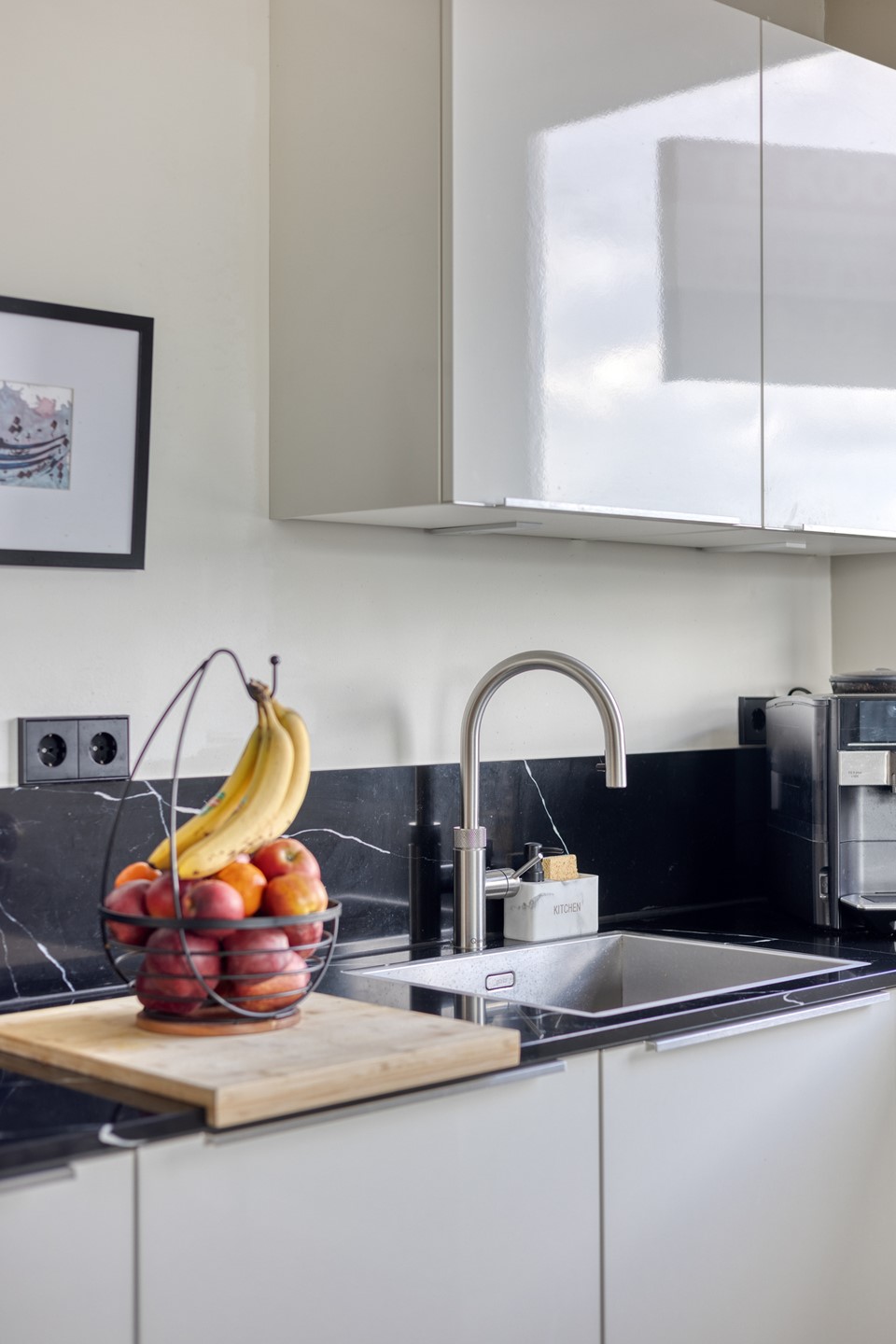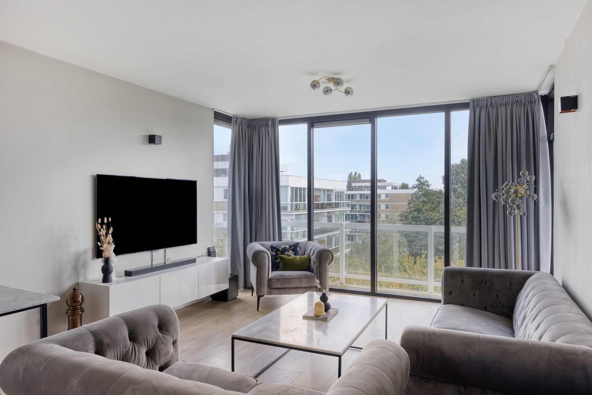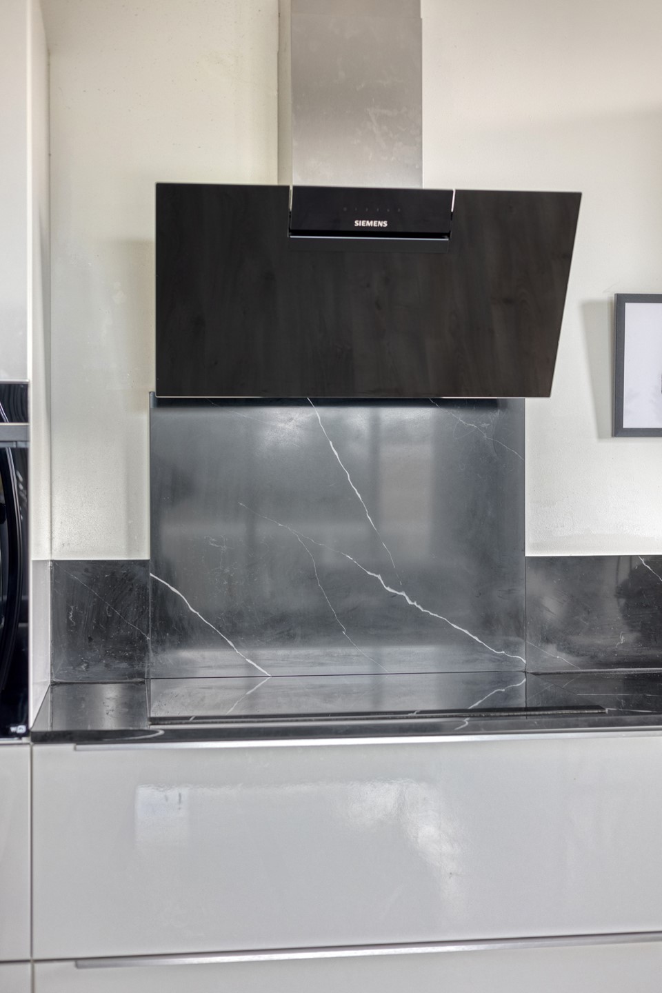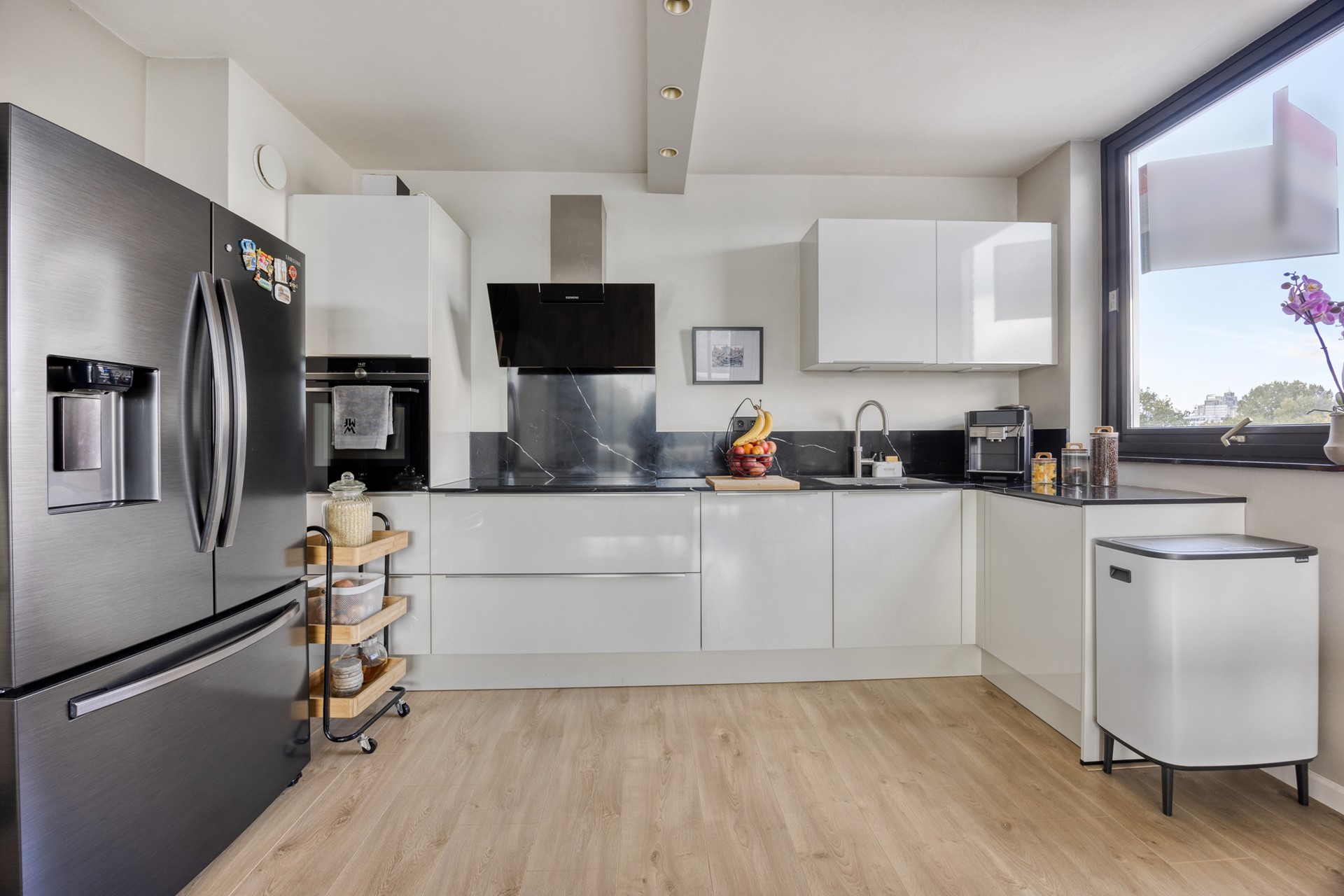De ruime woonkamer heeft veel lichtinval en een laminaatvloer. De moderne open keuken (2021) is volledig uitgerust met Siemens inbouwapparatuur: combi-oven, vaatwasser, industriële afzuigkap, Amerikaanse koelkast en een luxe composiet werkblad.