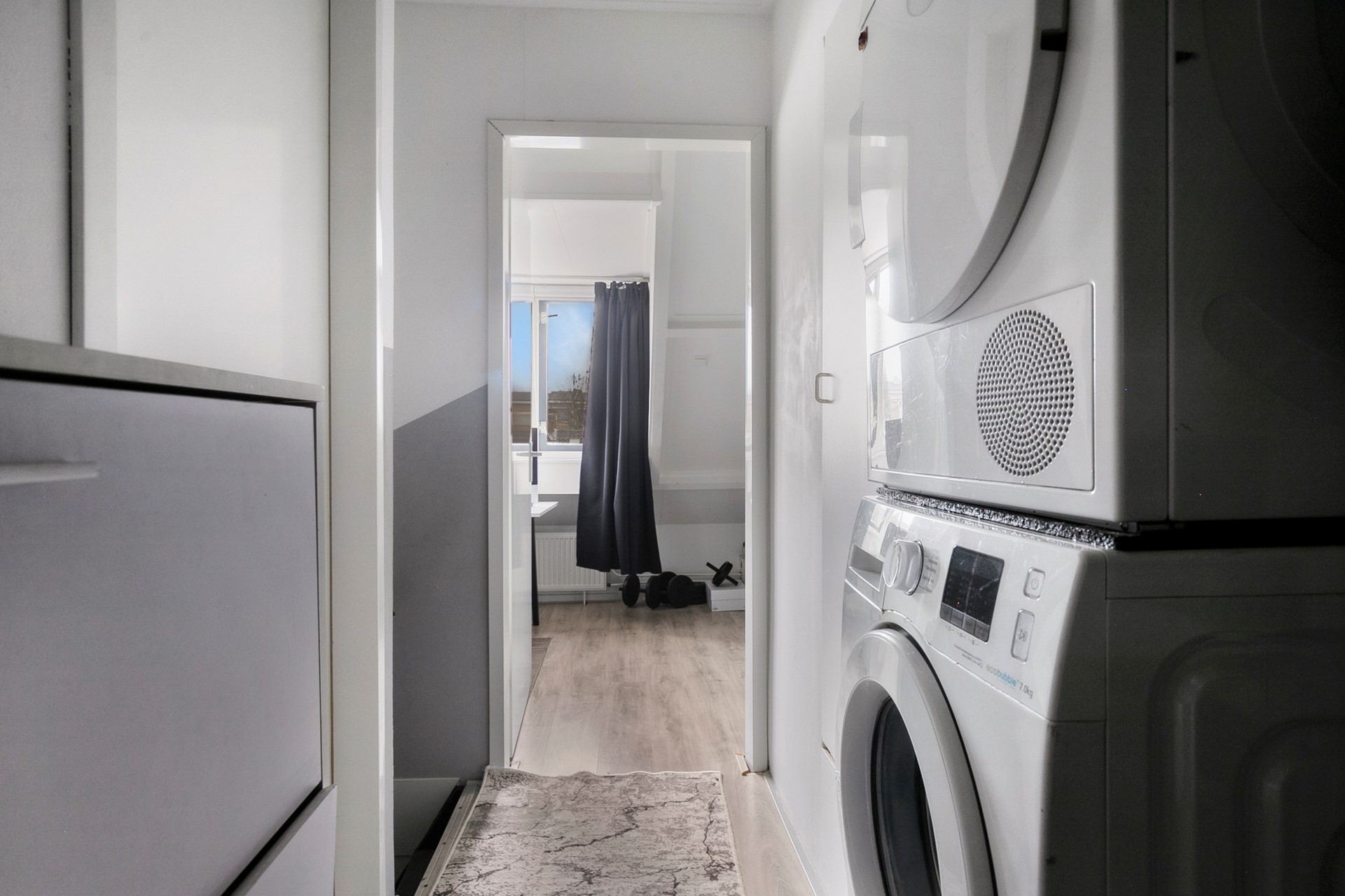 Aangrenzend vind je het praktische washok met aansluitingen voor wasmachine en droger.