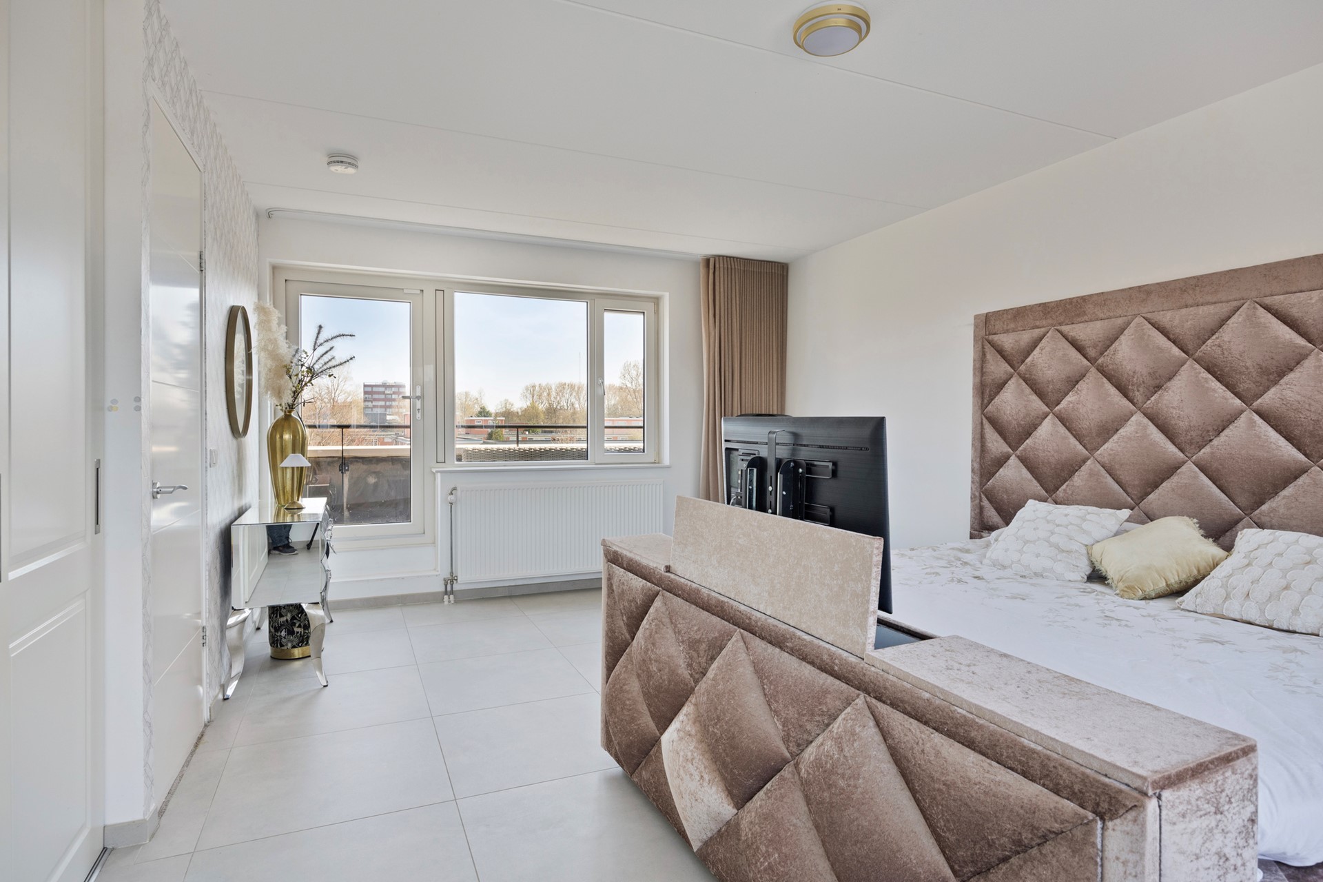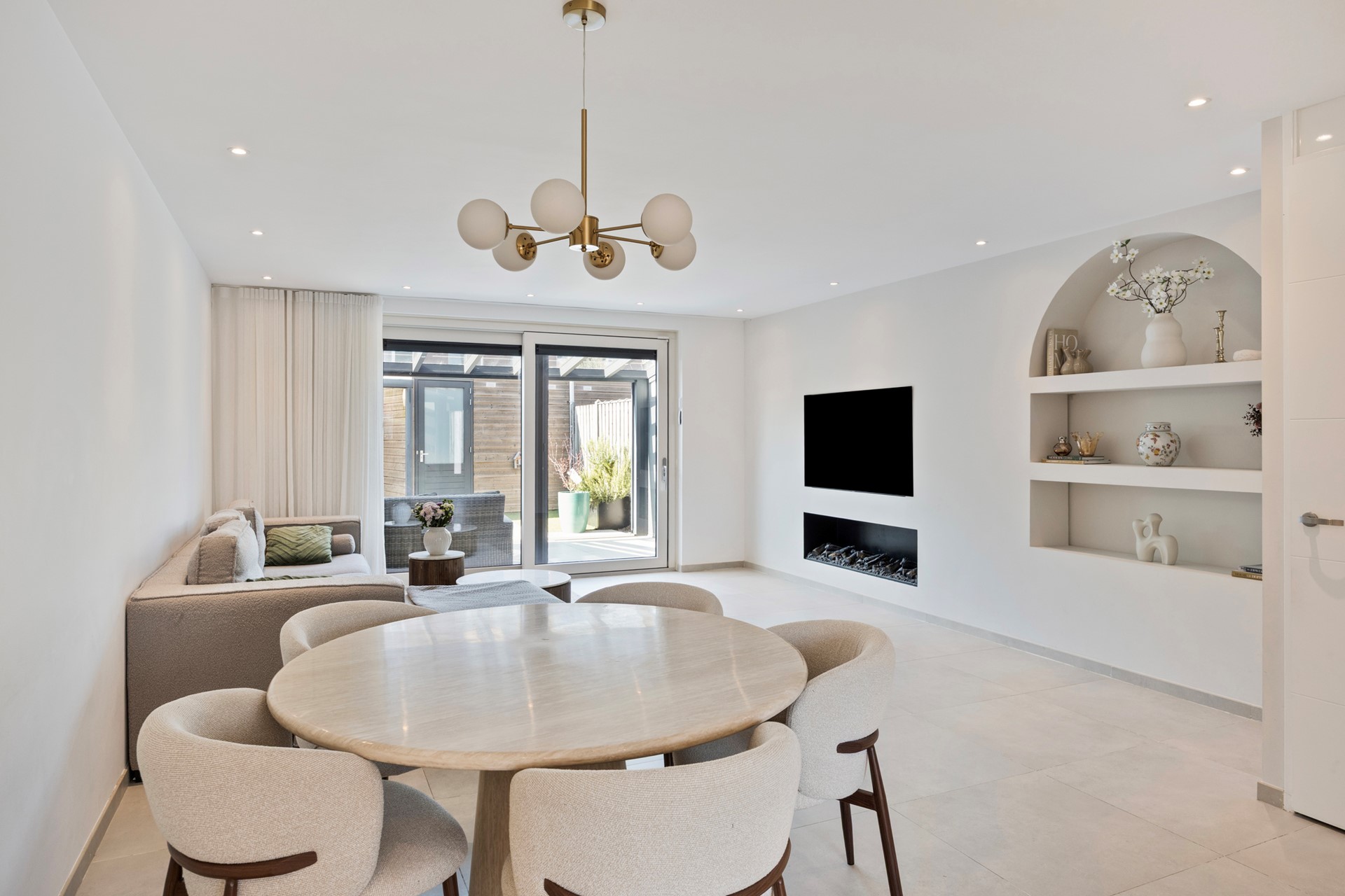 Continuing straight ahead, you enter the bright and spacious living room. The living room is equipped with comfortable underfloor heating, a sleekly finished cinewall, and large 80x80 cm floor tiles, creating a modern and luxurious appearance.
