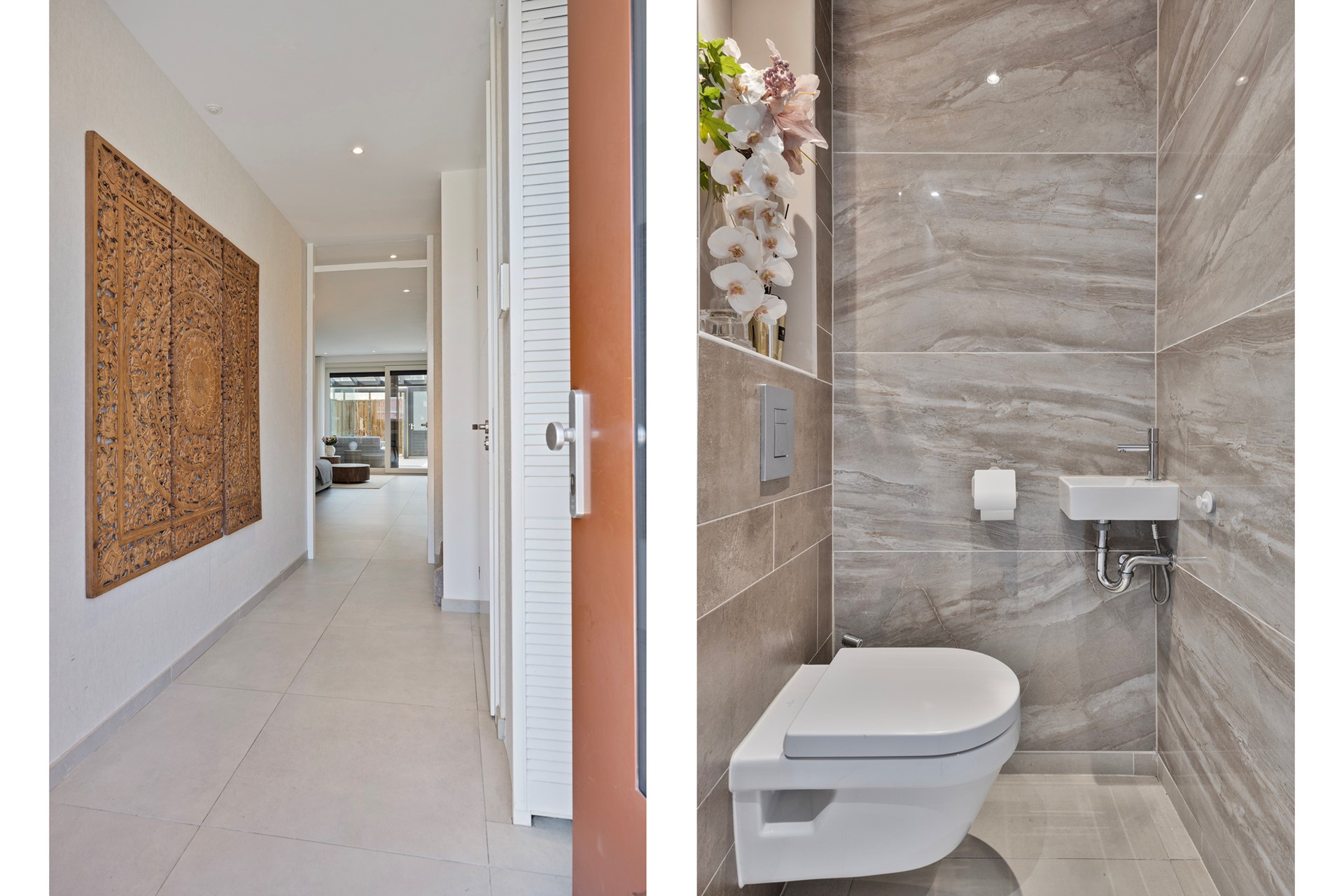 Bij binnenkomst wordt u verwelkomd in een ruime hal met aan de rechterzijde een modern afgewerkte toiletruimte, voorzien van stijlvolle tegels.