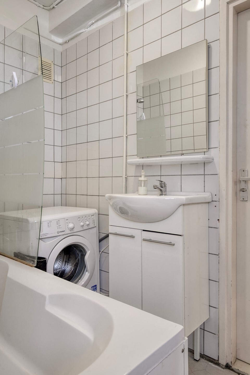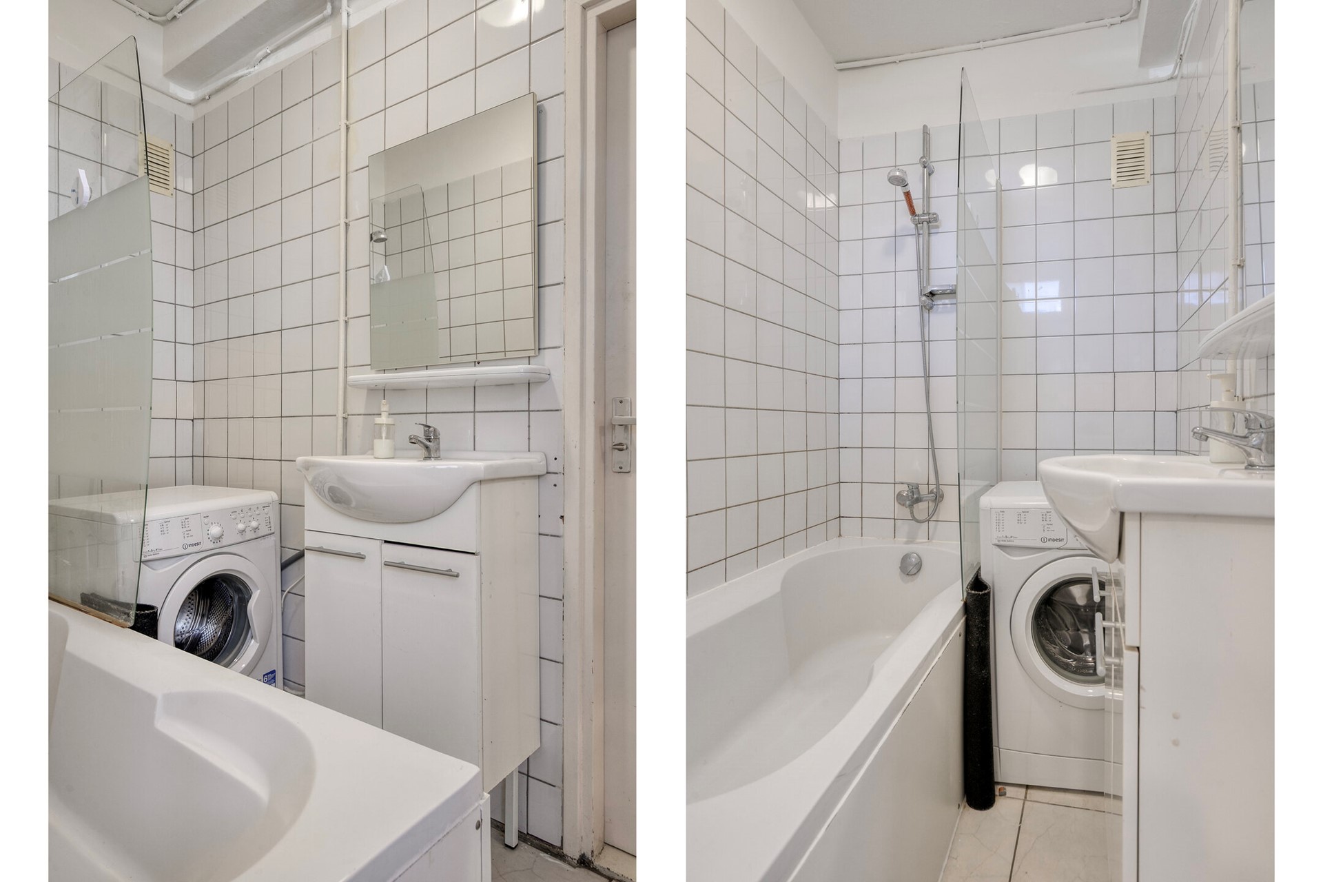The kitchen is simply designed and equipped with a refrigerator, oven, and sink. A dishwasher is not included. The bathroom is also basic and fitted with a bathtub and sink. Both the kitchen and bathroom provide a good base and can be modernized according to your own preferences.