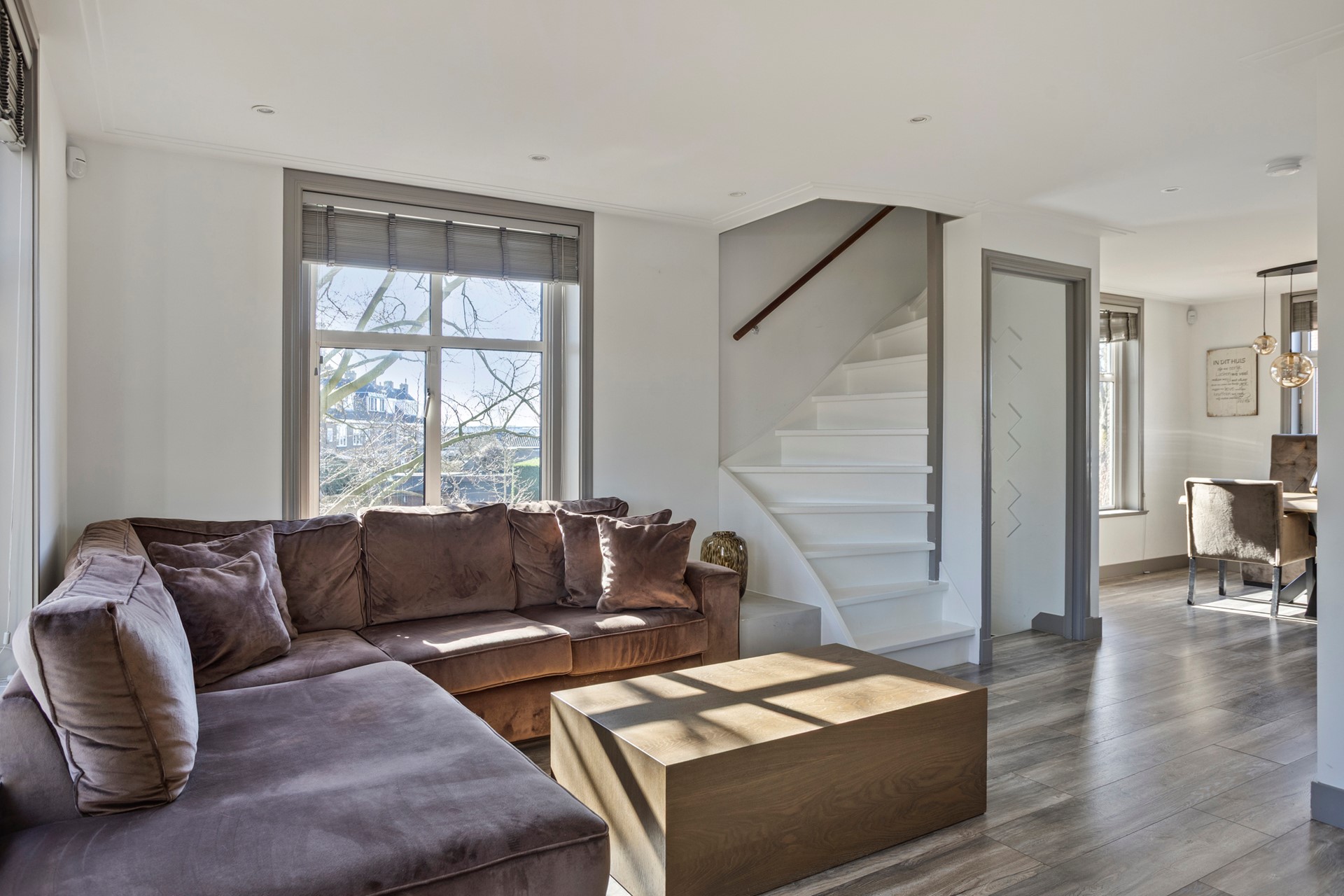 Upon entering the home you are welcomed into the bright and spacious living room. The living area is stylishly finished and features an elegant cinewall, creating a modern and luxurious atmosphere. This entire floor is equipped with underfloor heating, ensuring optimal comfort.