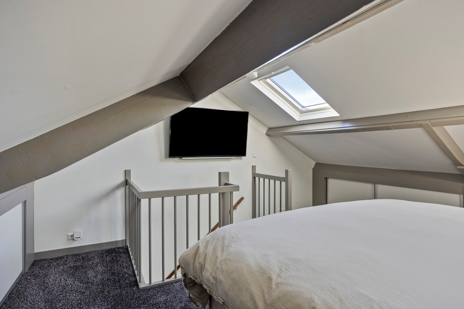 De bovenste verdieping biedt ruimte aan de vierde slaapkamer, een lichte en comfortabele kamer met nieuwe Velux dakramen. Deze kamer is bovendien uitgerust met airconditioning, waardoor het hier ook op warme dagen aangenaam verblijven is. Deze verdieping is ideaal als slaapkamer, thuiswerkplek of hobbyruimte.
