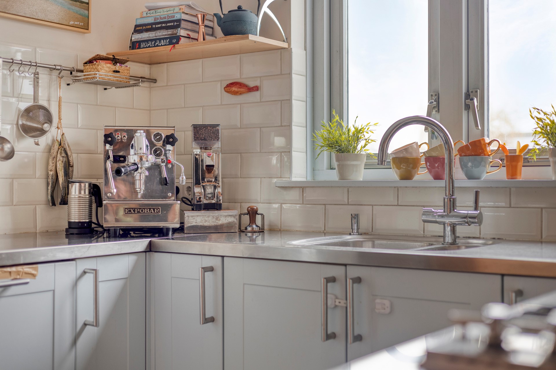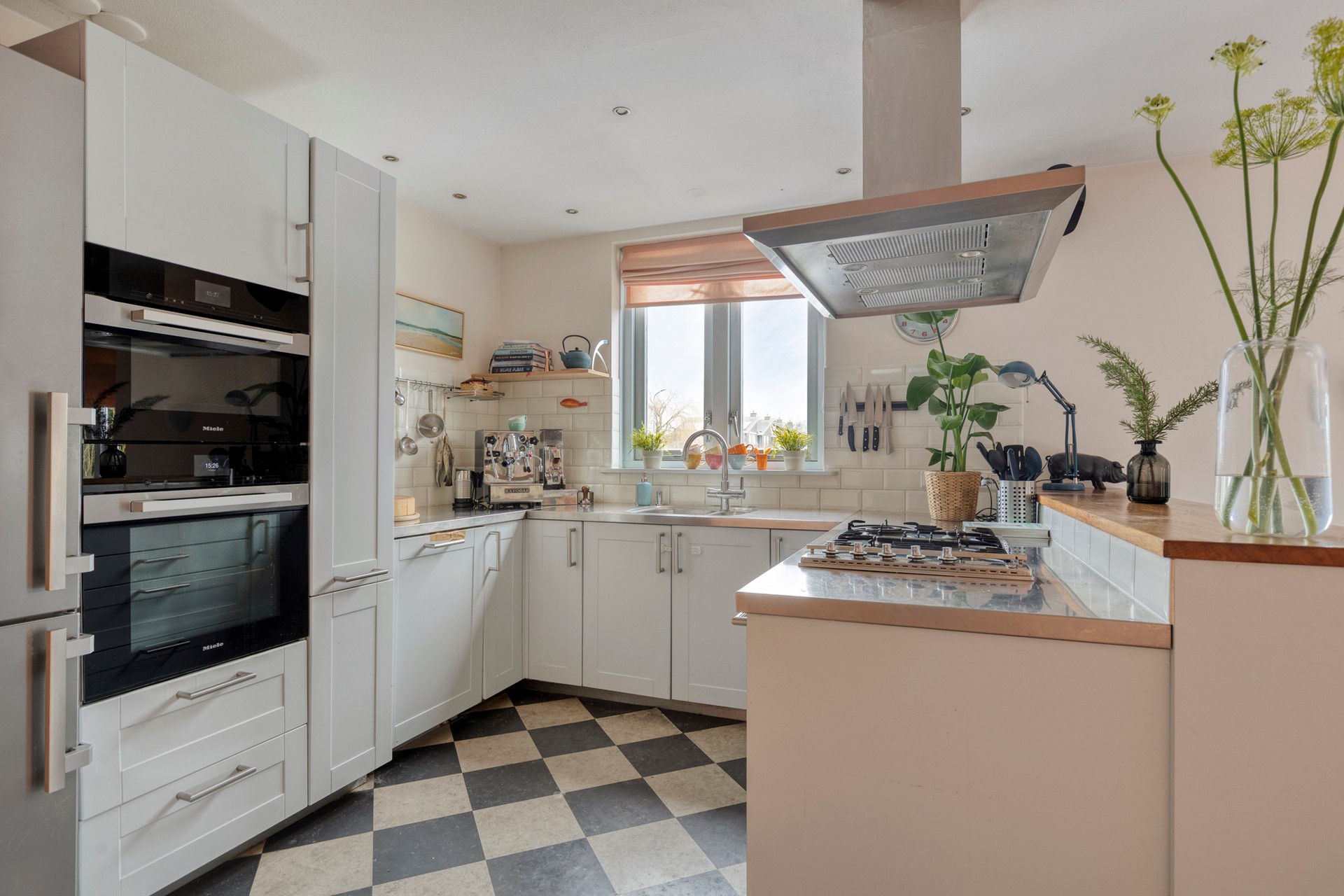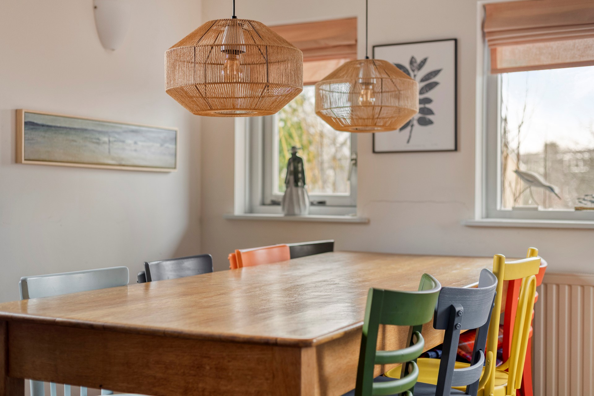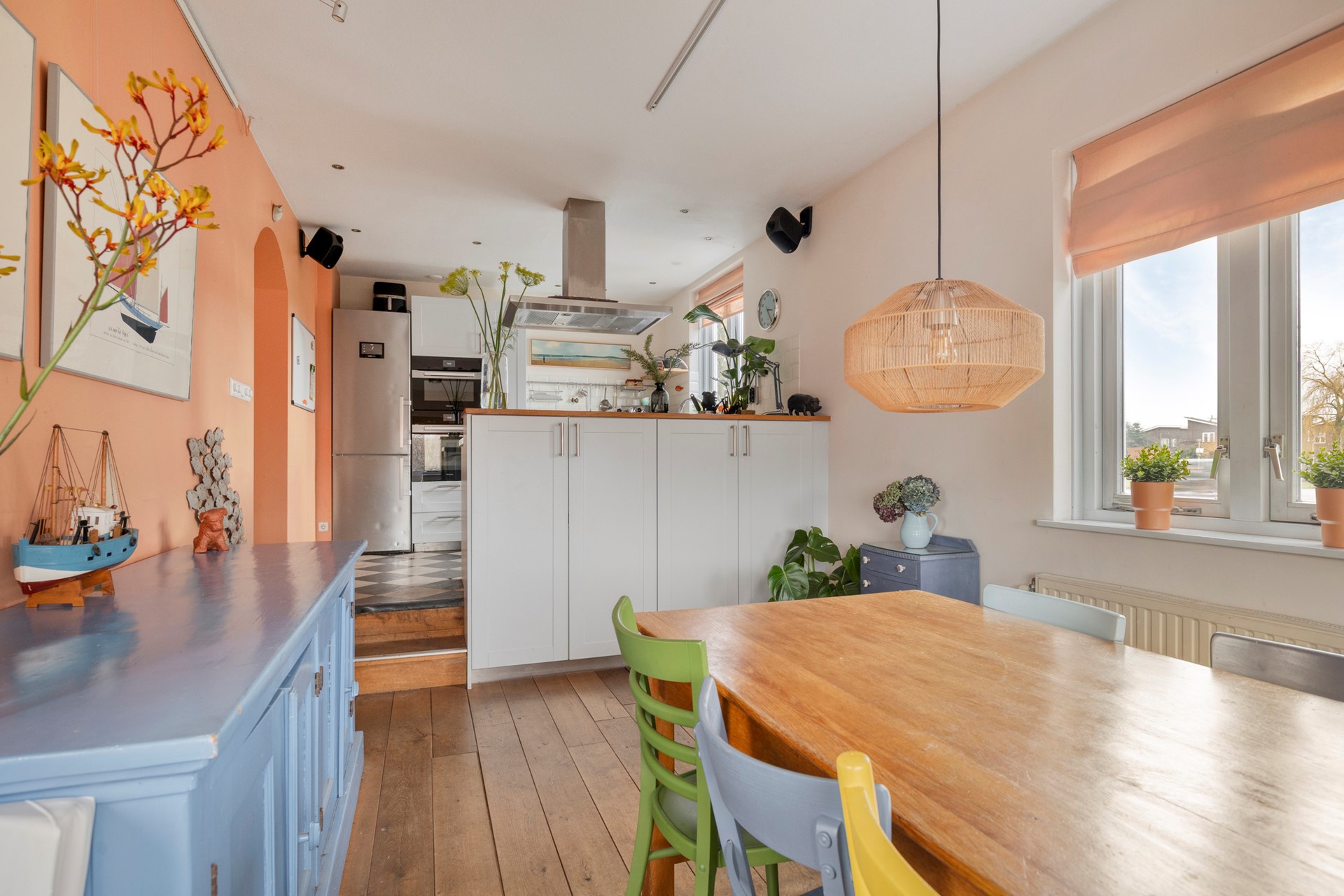 De U-vormige keuken is gesitueerd in de uitbouw en sluit aan op de lichte eetkamer. Met ramen aan twee zijden geniet je hier van uitzicht op de tuin én de Ringvaart. Niet voor niets één van de favoriete plekken van de huidige bewoners.