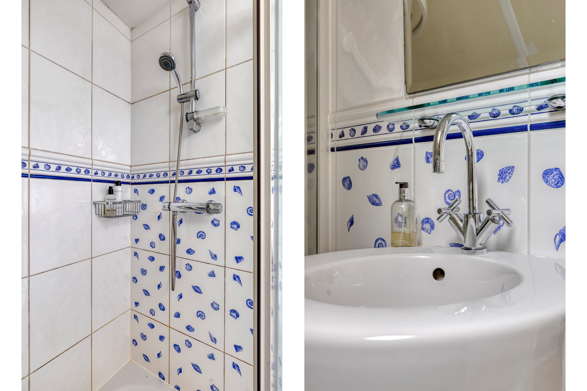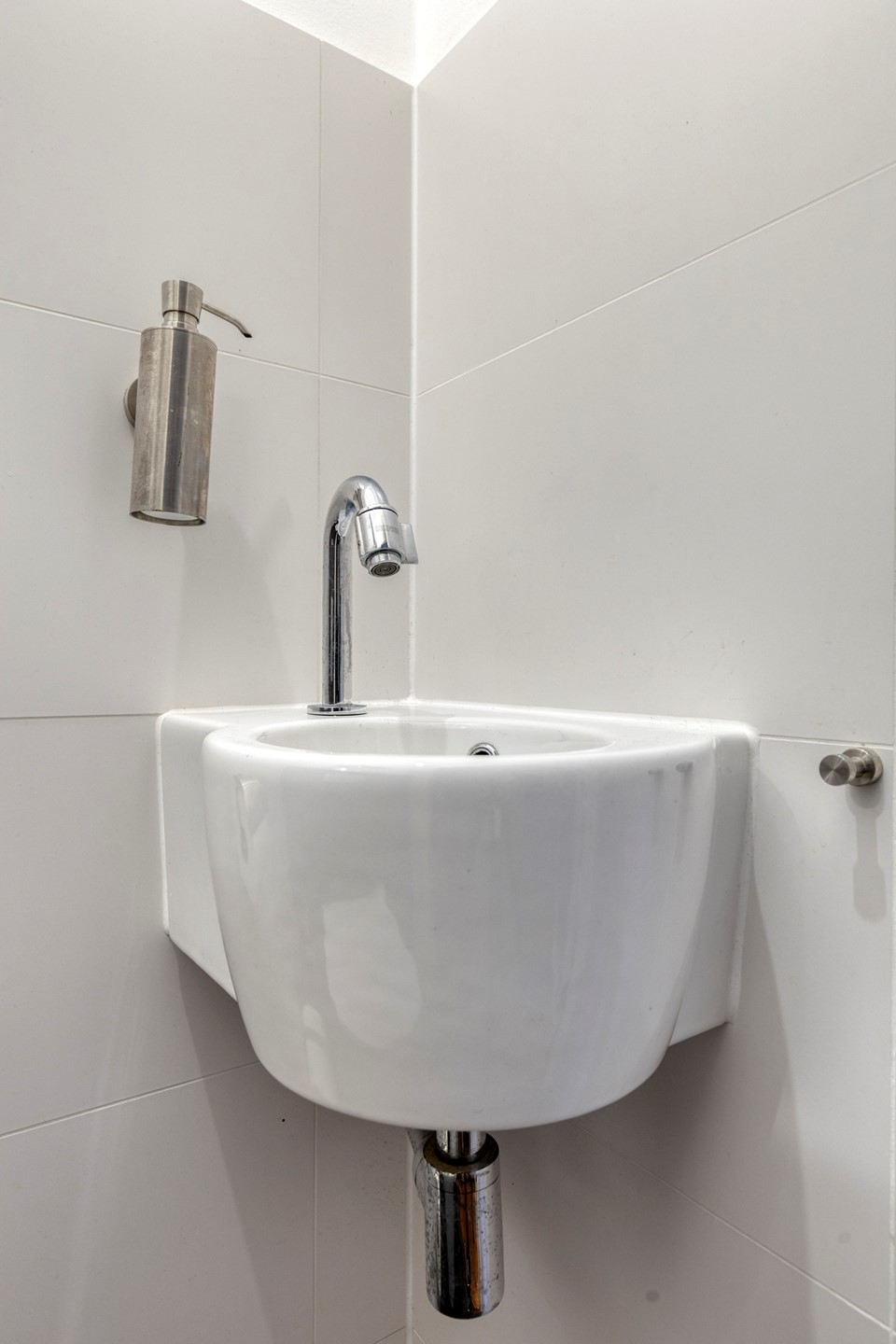 Een aparte badkamer met inloopdouche, wastafel en toilet