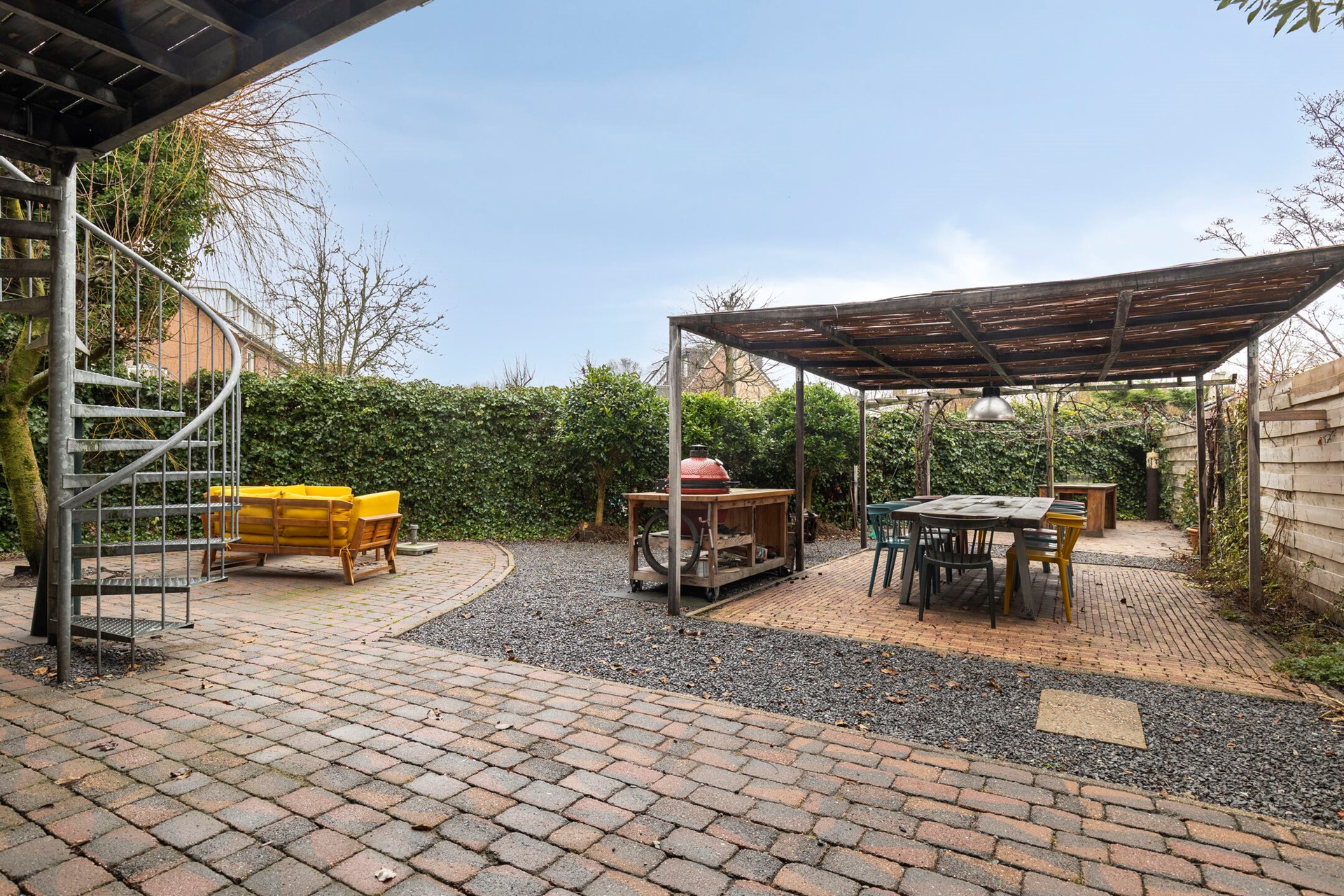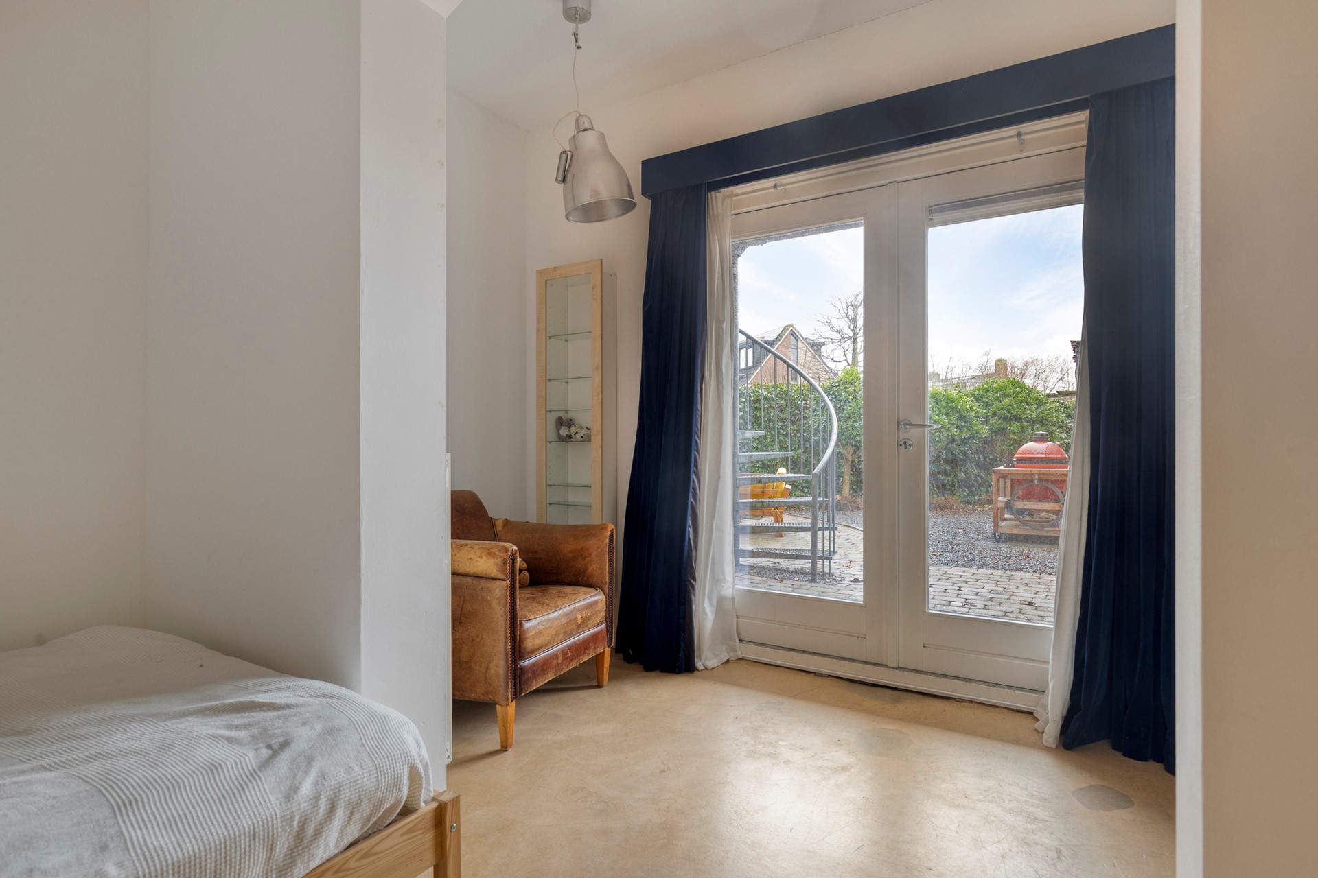 Aan de achterzijde bevindt zich een afgescheiden ruimte met toegang tot het ruime balkon. Via een wenteltrap bereik je direct de tuin een prachtige verbinding tussen binnen en buiten.