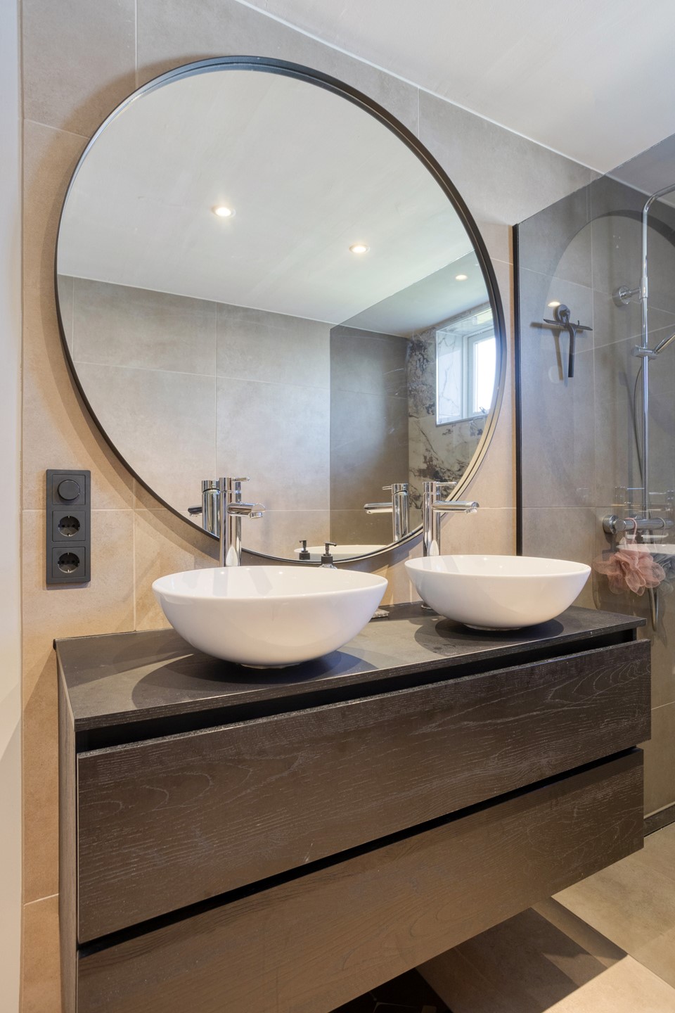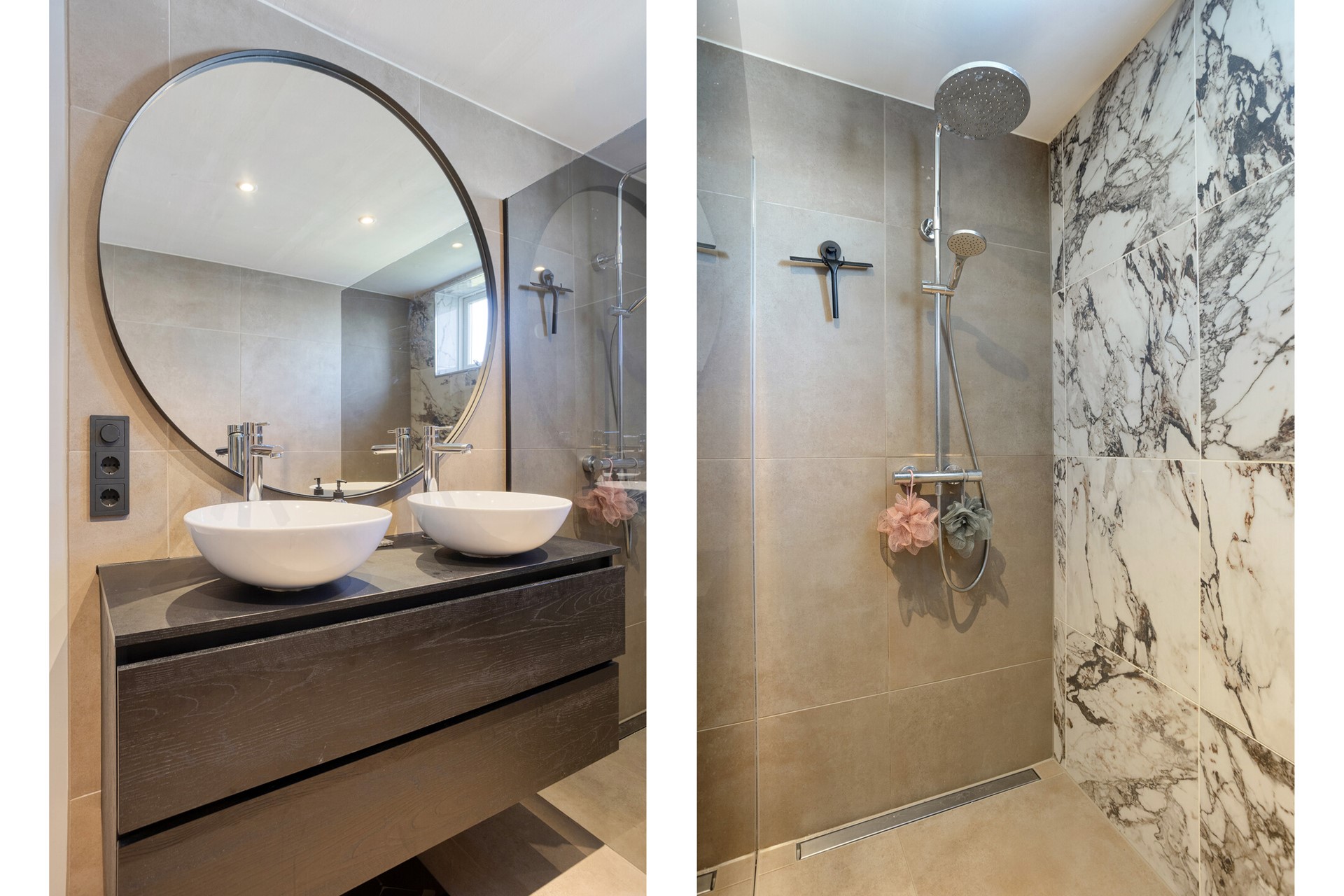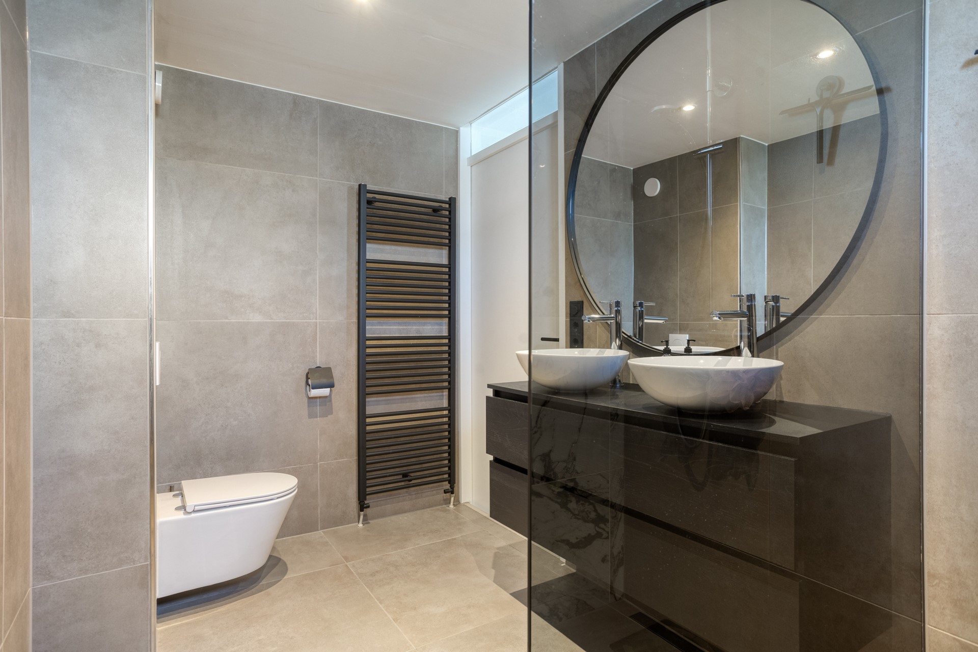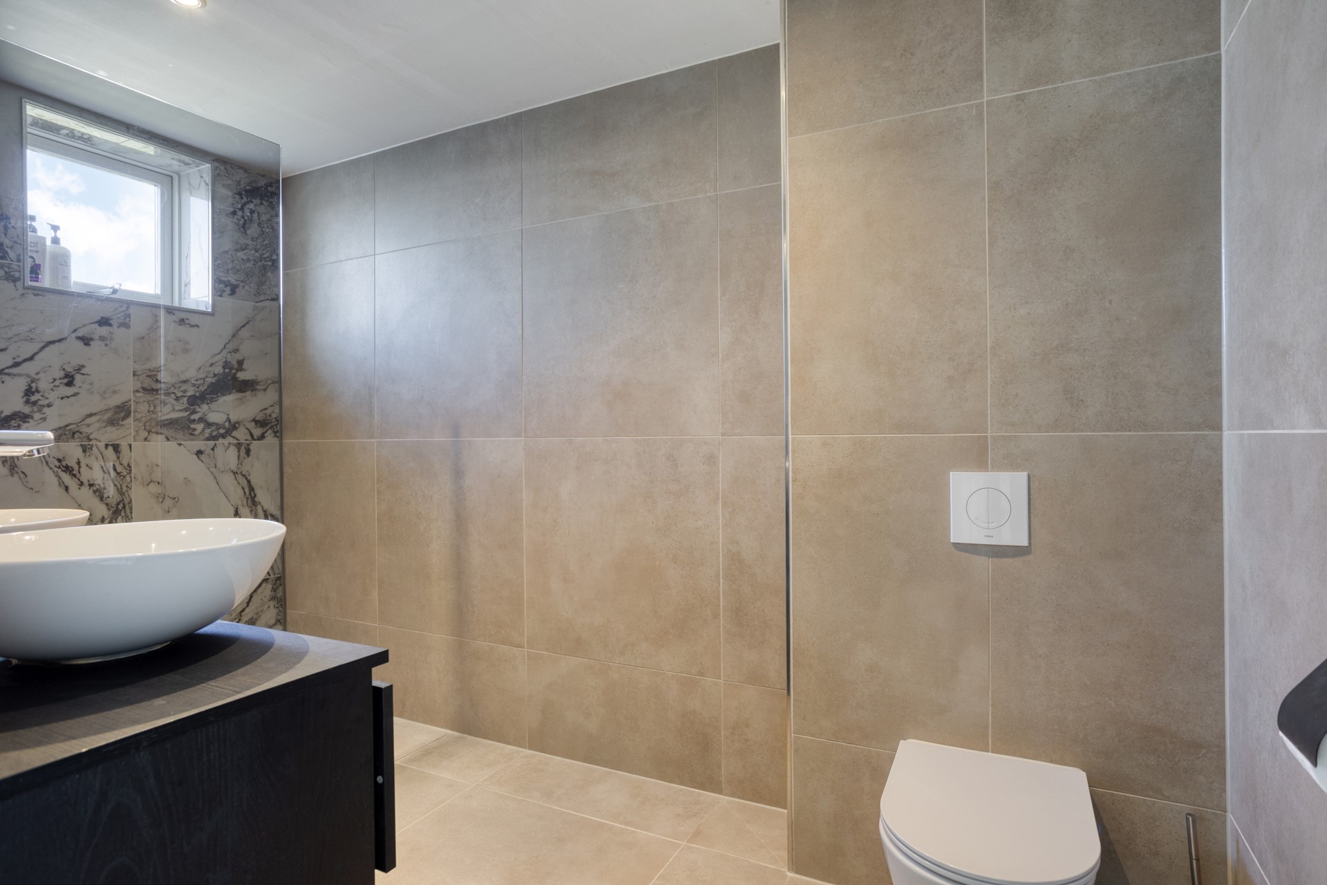 Op de eerste etage bevinden zich drie goed bemeten slaapkamers. De moderne badkamer (2021) is stijlvol afgewerkt en voorzien van een inloopdouche, dubbele wastafelkommen en een tweede toilet.
